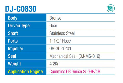 DJ PumpsCummins 6B Seris Sea water pump with 1-1/2" Ports ( Replaces Sherwood GC1) Aftermarket replacment pump Brand DJ model C0830 Use Impeller - SW 150...
