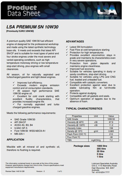 LSALSA Premium SN SAE10w/30 Premium fuel efficient petrol engine oil, with synthetic technology for proffessional workshops. Suitable for Turbo and No...