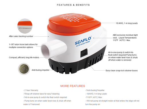 Marine Petrol PartsSeaflo 1100 GPH Auto Bilge Pump Seaflo 1100GPH Automatic Submersible Boat Bilge Water Pump.All-in-one pump & float switch. No additional float ...